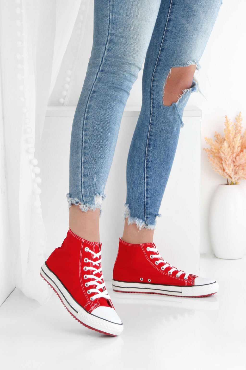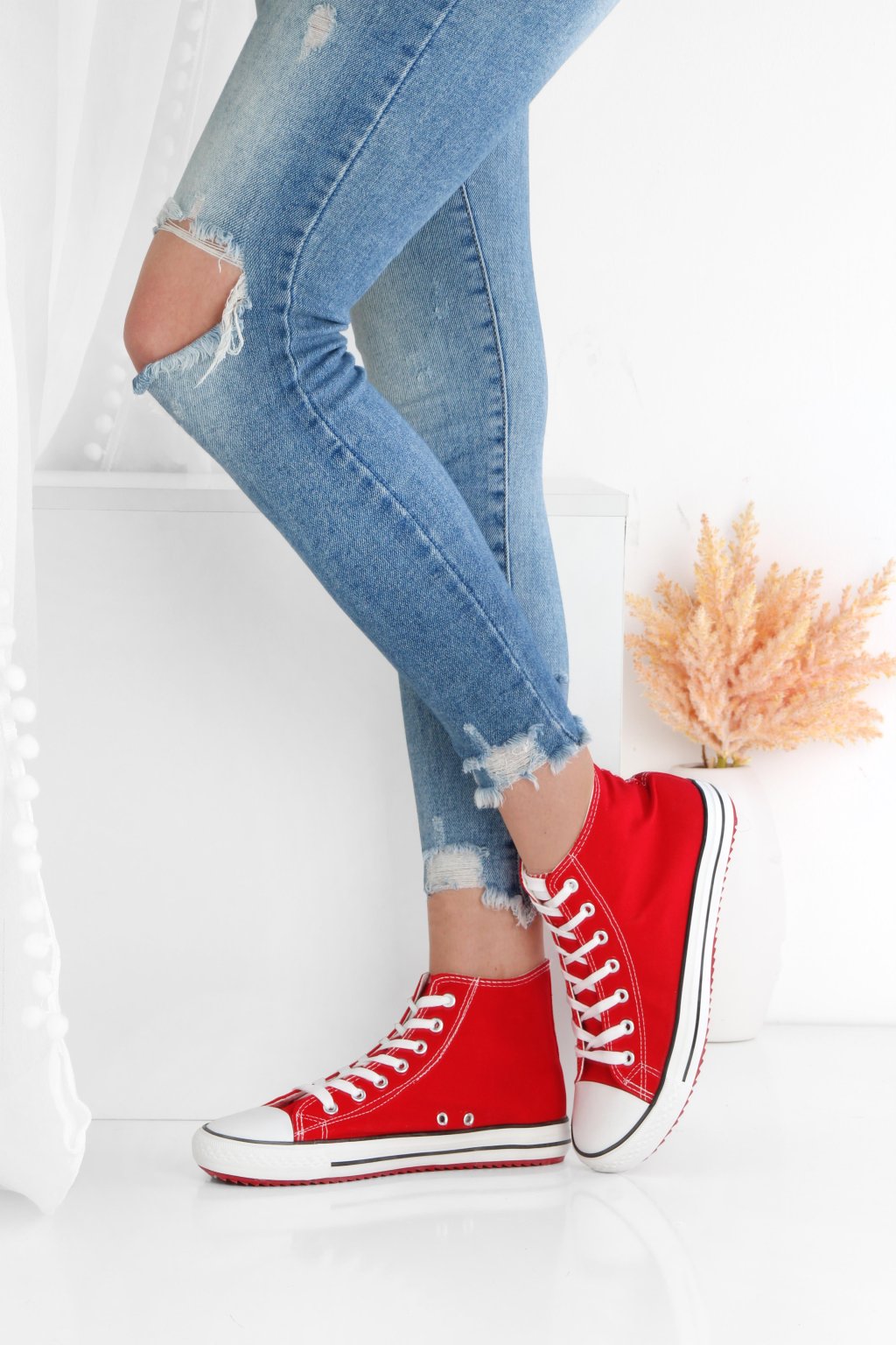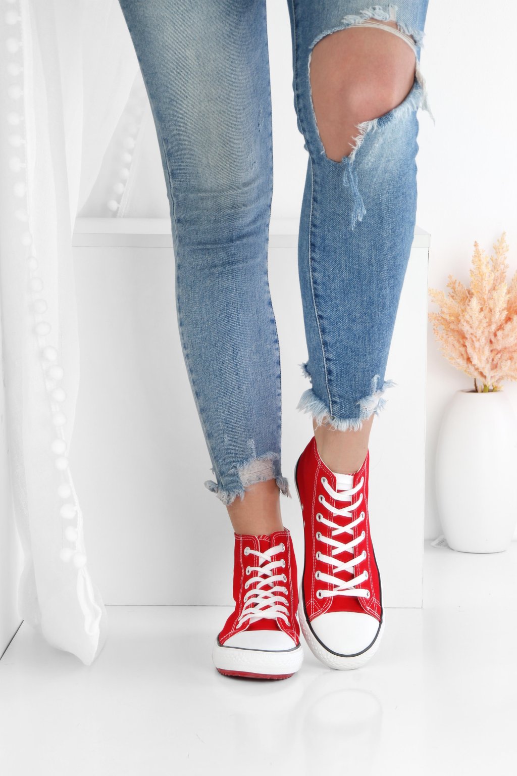 Kotníkové tenisky v červené barvě. Kotníkový střih je letos moderní a vypadá dobře. Tkaničky nemusíte šněrovat až úplně nahoru a získáte hned lehce ležérní vzhled.